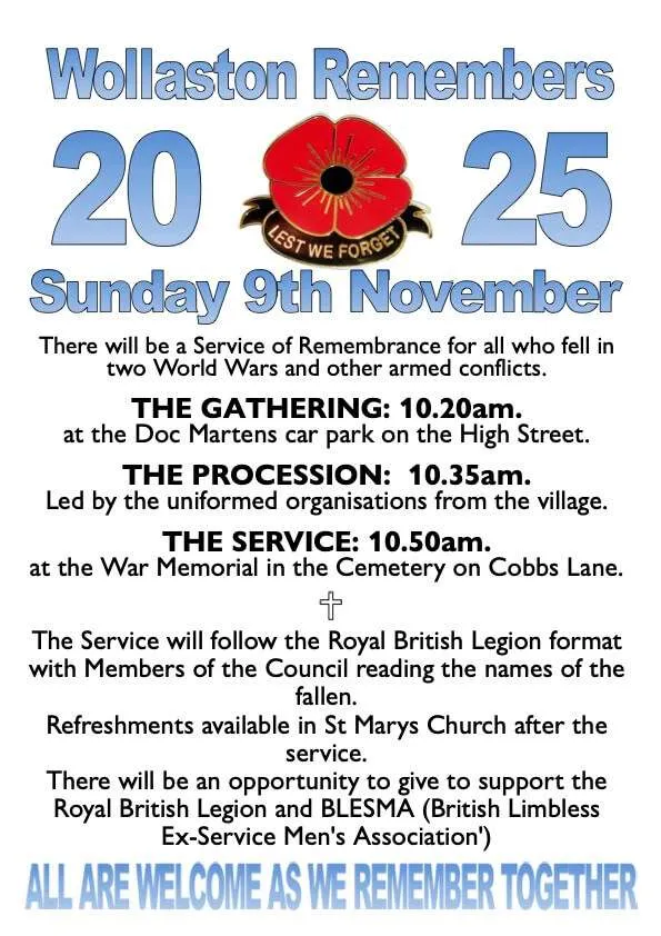 This Sunday (9th November), there will be no service at Wollaston Baptist Church, as we will be joining in with the Wollaston Remembrance Sunday service: